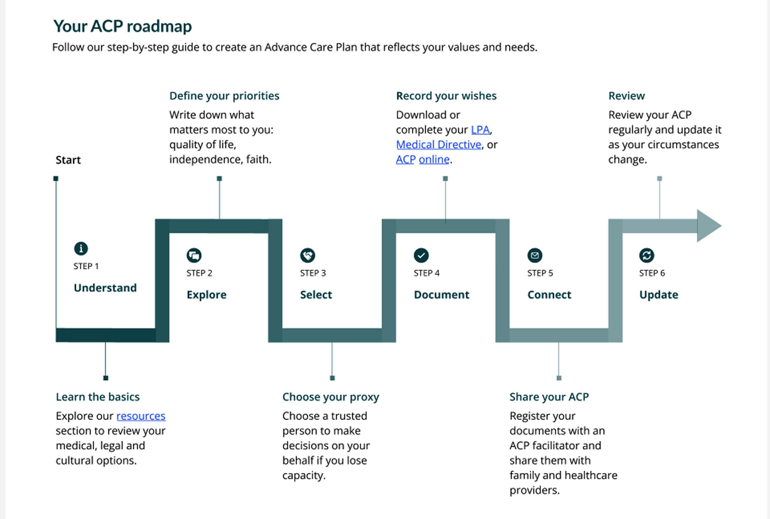 Guided “journeys” through planning topics (care options, legal documents, conversations)